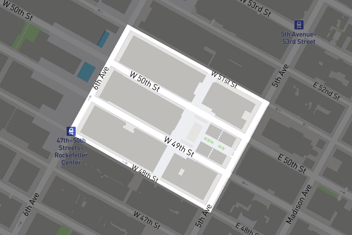 Rockefeller Center lies between 48th-51st Street and Fifth-Sixth Avenues