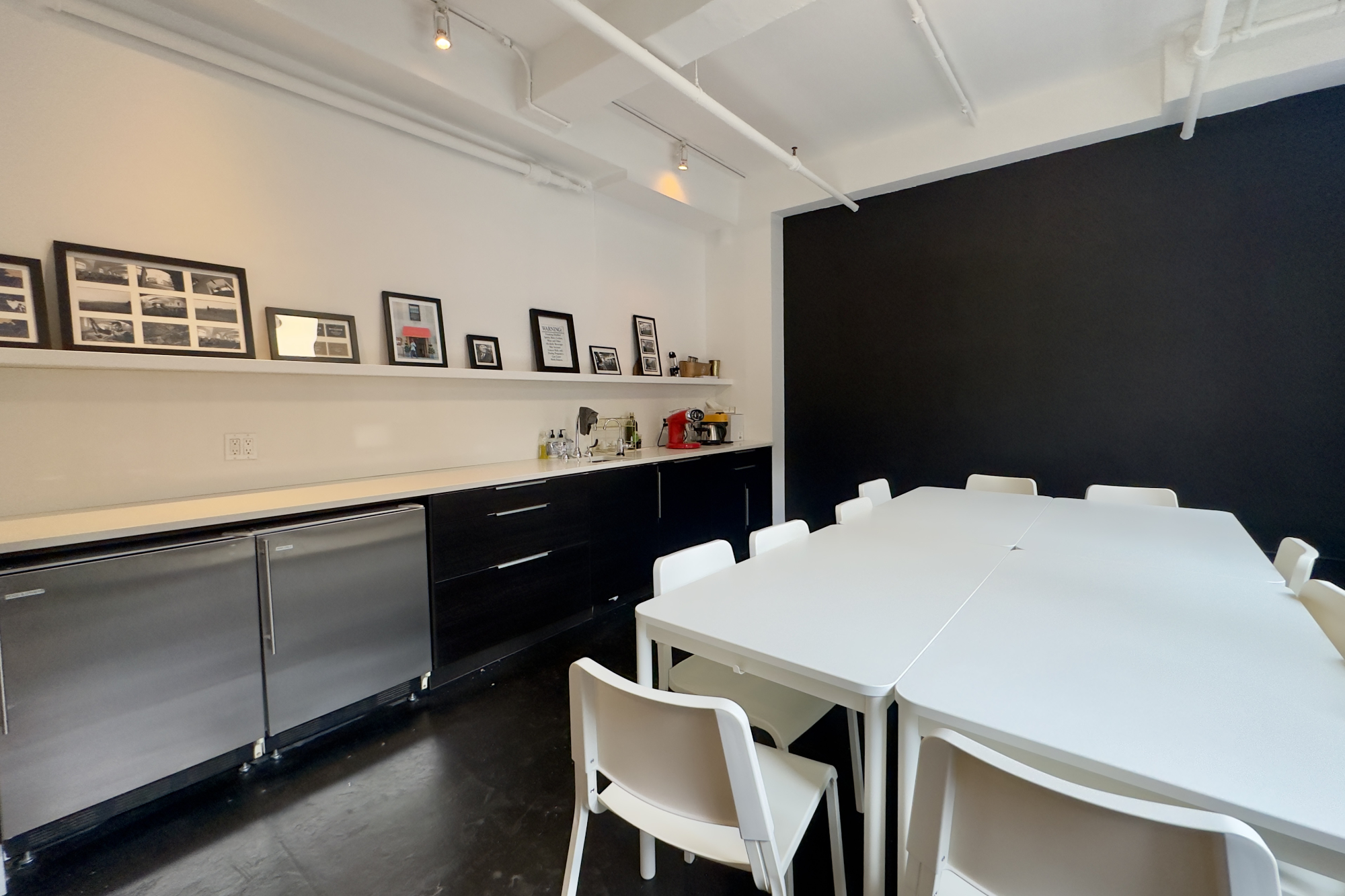 Kitchen with sink, refrigerator, and coffee makers