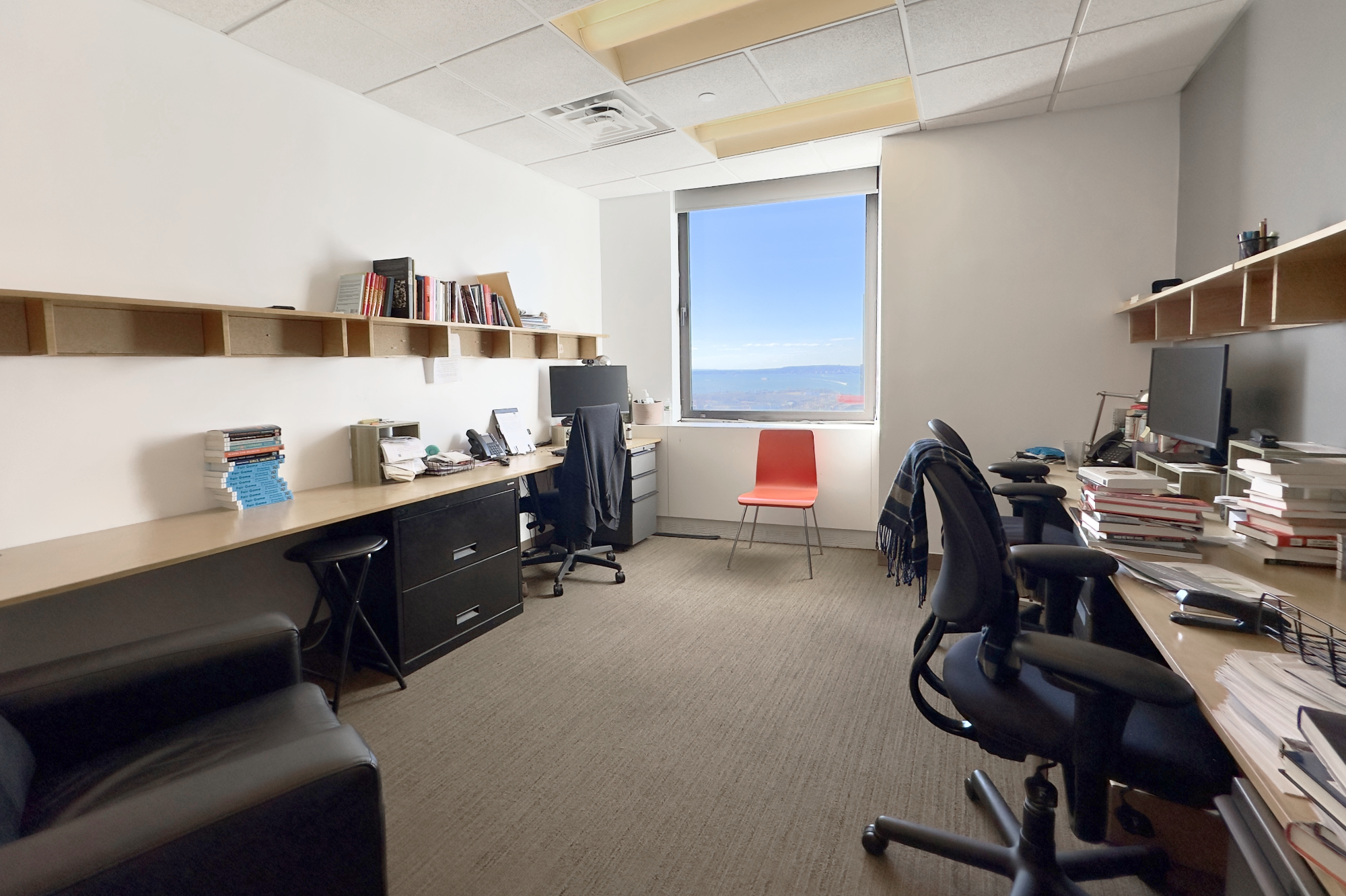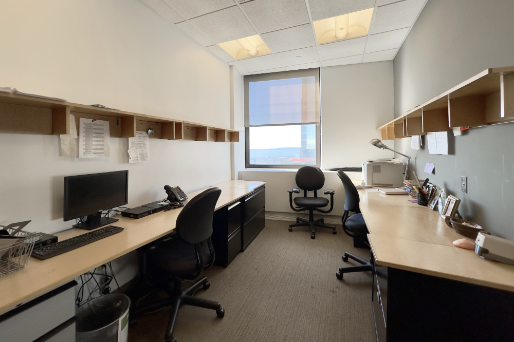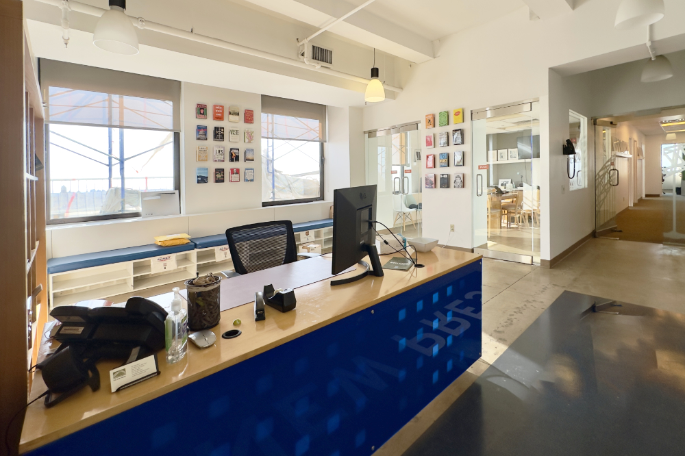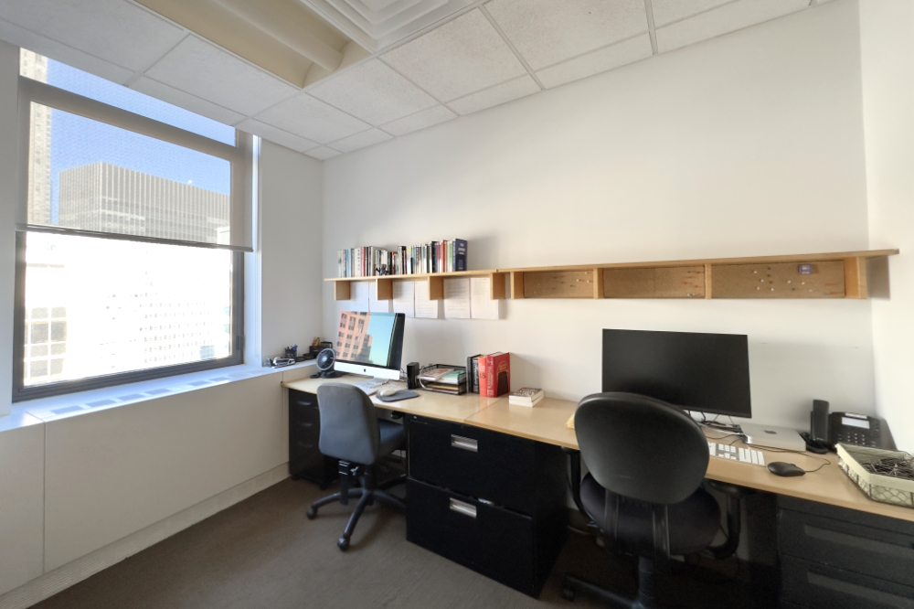 This shared office floor is located within a publisher’s suite on Wall Street in the Financial District and offers two private offices and approximately ten support desks for sublease. Situated on a high floor, the space features expansive views of New York Harbor, Governors Island, and Brooklyn. Furniture is in place, providing a turnkey setup, with access to two conference rooms and a shared kitchen. The building is a classic New York City office property with a doorman, turnstiles, and multiple elevators, and is conveniently located near major subway lines and Pier 11 ferry terminal.