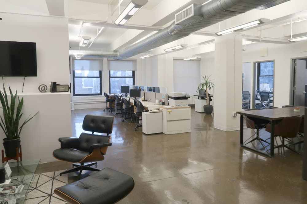 Located a couple blocks from Penn Station on Eighth Avenue at West 36th Street in a doorman building, a media company has a turnkey office space for sublease. This fully furnished office space is a corner unit with 3 private rooms, a large open area, and kitchenette. The space was recently built and has central AC, polished concrete floors, exposed ceilings, and modern light fixtures. Available immediately.